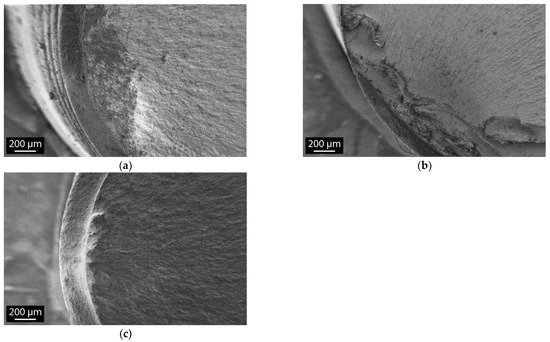 Implants aged at different times were observed in the SEM after fracture. In all cases, the fracture origin was detected on the edge of the fracture surface (Figure 4), indicating a fracture on surface features rather than intrinsic defects. This is true for all samples, whatever their ageing duration. Thus, ageing does not create additional defects able to impact resistance to fracture, in coherence with the observed monodisperse distribution of fracture loads for whatever ageing duration, as observed in the previous section.