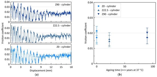 (a) Examples of scratch tests results: friction coefficient versus displacement. (b) Evolution of friction coefficient with ageing time. Error bars are one standard deviation.