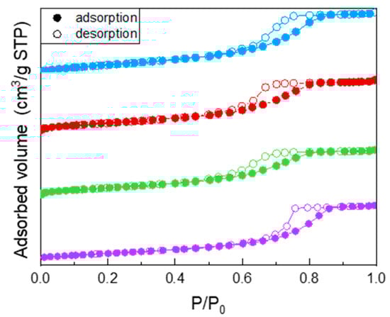 N2 adsorption/desorption isotherms at −196 °C obtained with the following samples: undoped TiO2 (purple circles), Fe(3.5)-TiO2 (green circles), Fe(2.5)-TiO2 (red circles), Fe(1.0)-TiO2 (light blue circles).