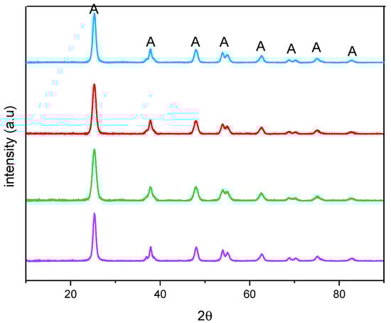 X-ray Powder Diffraction patterns obtained with the undoped TiO2 (purple), Fe(3.5)-TiO2 (green), Fe(2.5)-TiO2 (red), and Fe(1.0)-TiO2 (light blue).