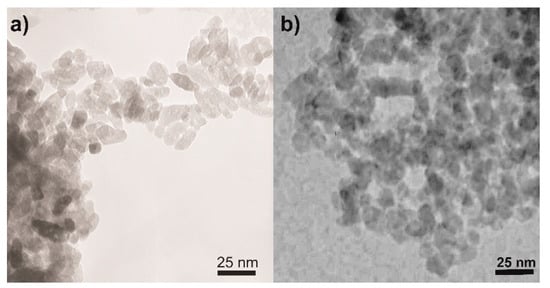 Concerning the NPs morphology, Figure 3 shows the TEM micrographs of two selected samples, namely, the undoped TiO2 (Figure 3a) and the sample at the intermediate Fe content, i.e., Fe(2.5)-TiO2 (Figure 3b): in agreement with previous studies showing that this synthesis leads to the formation of elongated particles with rather uniform shape and dimension, forming agglomerates with interparticle mesoporosity [45,51] and that Fe-doping does not alter the NPs shape [45,51], the TEM analysis showed the occurrence of agglomerated NPs of rather uniform shape and size with both samples.