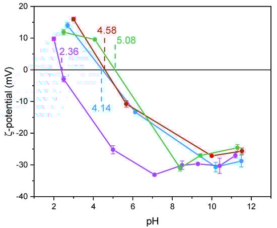 ζ-potential curves obtained by measuring the electrophoretic mobility as a function of pH obtained with the undoped TiO2 (purple line), Fe(3.5)-TiO2 (green line), Fe(2.5)-TiO2 (red line), Fe(1.0)-TiO2 (light blue line). For each point, an average of three measures is reported, with the related error bar.