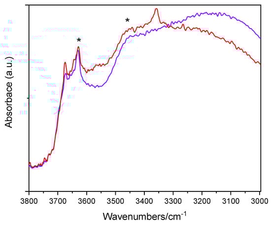 Selected IR spectra obtained with the undoped TiO2 sample (purple) and the Fe(2.5)-TiO2 sample (red). The bands at 3630 and ~3460 cm−1 are labelled by asterisks (*).