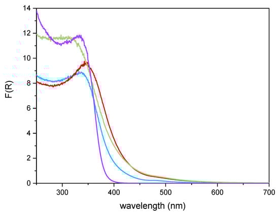 Figure 6 reports the DR UV–Vis spectra of the powder samples. The undoped TiO2 sample showed absorption below 400 nm, due to the O2− to Ti4+ Charge Transfers (CT) transitions. Upon Fe addition, different onsets of absorption (i.e., at longer wavelength) are observed depending on overall Fe content. Additionally, with Fe-doped samples, a new signal is observed at 475 nm, ascribed in the literature to d–d transition of octahedrally coordinated Fe3+ ions, likely located at the particles surface, as already observed with other types of samples obtained by impregnation of TiO2 [60]. Such Fe3+ species belong to Fe2O3 clusters or Fe-oxo/hydroxide clusters (too low and/or too poorly crystalline to be detected by XRD), likely located at the particles surface [61,62]. The presence of such signal complicates the evaluation of the band gap in the Fe-doped samples. Therefore, the corresponding band gap energy (Eg) values reported in Table 2 were calculated by applying three different methods, namely, the linear extrapolation of the spectra absorption edge (Figure 6), the Tauc’s plot method (Figure 7), for indirect semi-conductors (F(R)xhν)1/2 in agreement with to the presence of anatase for the whole set of samples) and a literature method that requires subtracting the dopant contribution from the Tauc’s plot [50]. Regardless which the method is applied, Eg values are obtained by a graphical manipulation of the original DR UV Vis spectra: for the sake of completeness, the average values of the Eg obtained by using the three methods are also reported in Table 2.