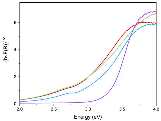 Tauc’s plot applied to the undoped TiO2 sample (purple line), Fe(3.5)-TiO2 (green line), Fe(2.5)-TiO2 (red line), and Fe(1.0)-TiO2 (light blue line).
