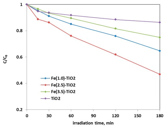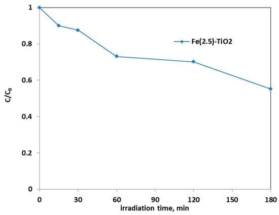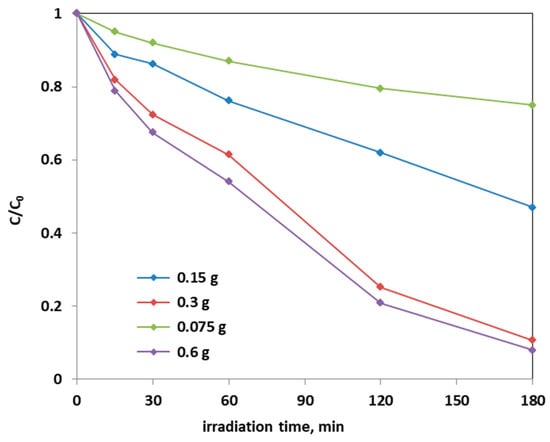 Further photocatalytic tests were carried out to establish the optimal dosage of Fe(2.5)-TiO2 photocatalyst, which showed the higher photodegradation activity of AO7 aqueous solution: in Figure 12, it is possible to observe the decrease in the relative concentration of AO7 as a function of the Fe(2.5)-TiO2 photocatalyst dosage.