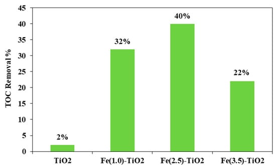 TOC Removal (%) from the AO7 aqueous solution after 180 min of visible using Fe(1.0)-TiO2, Fe(2.5)-TiO2, Fe(3.5)-TiO2, and undoped TiO2 photocatalysts.