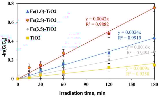 −ln(C/C0) versus irradiation time (min) for evaluation of discoloration kinetic after 180 min of visible irradiation using undoped TiO2 (yellow), Fe(1.0)-TiO2 ( blue), Fe(2.5)-TiO2 (red), and Fe(3.5)-TiO2 (gray) photocatalysts.