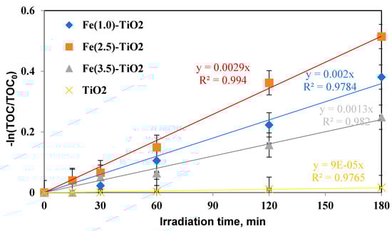 −ln(TOC/TOC0) versus irradiation time (min) for evaluation of mineralization kinetic after 180 min of visible irradiation using undoped TiO2 (yellow), Fe(1.0)-TiO2 ( blue), Fe(2.5)-TiO2 (orange), and Fe(3.5)-TiO2 (gray) photocatalysts.