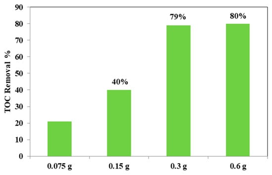 TOC removal (%) from the AO7 aqueous solution after 180 min of visible irradiation using different loads of optimized Fe(2.5)-TiO2 photocatalyst.