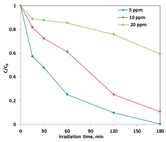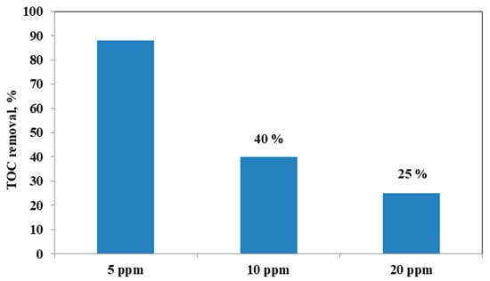 It could be observed that with the increase in the initial AO7 concentration, the decrease in the efficiency of the solution discoloration was obtained. In particular, considering 0.3 g of the same optimized photocatalyst the efficiency of photocatalytic discoloration after 180 min of visible irradiation was equal to 41% with 20 ppm of AO7 initial concentration, while with a lower value of AO7 initial concentration (10 ppm) the efficiency of photocatalytic discoloration increased to 90%. However, the color of the solution was completely removed after 180 min of visible irradiation using an AO7 initial concentration of 5 ppm. This behavior can be explained considering that, with the increase in AO7 initial concentration dye, a higher number of dye molecules are adsorbed on the photocatalyst surface. Therefore, a significant fraction of visible light is absorbed by AO7 itself rather than the photocatalyst particles. As a consequence, the penetration of light to the surface of the photocatalyst decreases [68]. Furthermore, the mineralization efficiency also increased when the initial concentration of AO7 decreased (Figure 15).