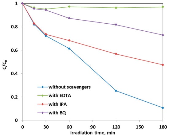 The photocatalytic test was then started under visible light irradiation up to 180 min. During the light irradiation, the reaction suspension was continuously mixed using a magnetic stirrer to avoid the sedimentation of the photocatalyst at the bottom of the photoreactor. The photocatalytic reactor was equipped with an air distributor device (Qair = 150 cm3·min−1 (STP)) to assure the presence of oxygen in the reaction medium. In addition, a fan cooling system was positioned near the photoreactor to prevent an increase of the reaction temperature with the lighting of the LEDs. Table 1 reports the reaction conditions used for the photocatalytic tests.