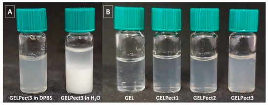 The preparation of GELPect slurries was initially optimized by visual assessments of slurry appearance and flow behavior. First attempts at preparing GELPect formulations were performed using ultrapure water. However, unstable and phase-separated slurries were obtained in this case (Figure 1A), due to the possible formation of insoluble gelatin–pectin complex coacervates [38,39]. Conversely, homogenous and viscous slurries were successfully produced with GELPect in DPBS (pH 7.4, ionic strength 170 mM) solvent for all pectin contents (Figure 1B). We hypothesize that the ionic strength of DPBS and its initial pH may have prevented the formation of gelatin–pectin aggregates. The presence of free ionic species in DPBS, in fact, may have weakened the electrostatic attraction between positively charged gelatin and the negatively charged pectin [38,39].