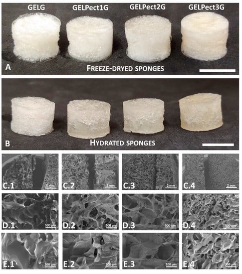Images of GELG, GELPect1G, GELPect2G, and GELPect3G sponges as-freeze dried (A) and after rehydration (B); SEM images of freeze-dried GEL (C.1,D.1,E.1), GELPect1G (C.2,D.2,E.2), GELPect2G (C.3,D.3,E.3), and GELPect3G (C.4,D.4,E.4) sponges (scale bars: A, B = 10 mm, C.1–C.4 = 2 mm, D.1–D.4 = 500 µm, E.1–E.4 = 200 µm).