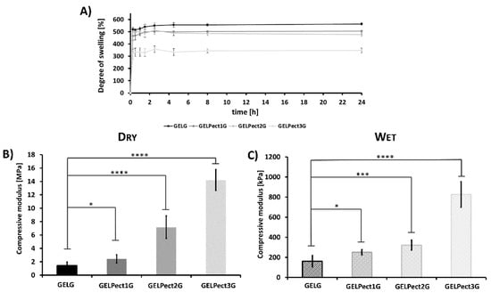 Degree of swelling over time of GEL, GELPect1, GELPect2, and GELPect3 sponges (A). Compressive modulus of dry (B) and wet (C) GELG, GELPect1G, GELPect2G, and GELPect3G sponges. (Student’s t-test significance levels * = p < 0.05, *** = p < 0.0005, **** = p < 0.0001, comparing the compressive modulus of GELG (control) and other GELPectG sponges).