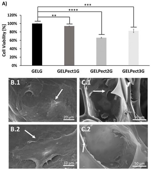 Cell viability at 48 h of MG-63 cells seeded on GELG and GELPectG sponges (Student’s t-test significance levels: ** = p < 0.005, *** = p < 0.0005, **** = p < 0.0001, comparing the metabolic activity of cells on GELG (control) and on other GELPectG sponges) (A). Representative SEM images of adherent MG-63 cells on GELPect1G (B.1,B.2), and GELPect3G (C.1,C.2) sponges at 48 h. (Scale bars: B.1 = 20 µm, B.2 = 10 µm, C.1,C.2 = 50 µm).