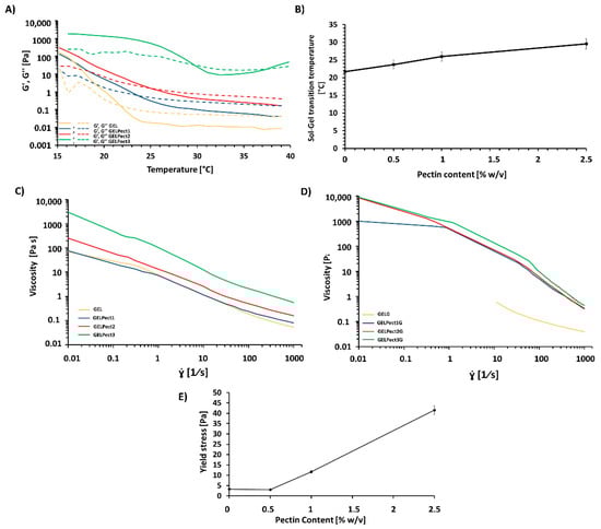Temperature dependence of storage modulus (G’, continuous line) and loss modulus (G’’, dashed line) of GEL and GELPect slurries within the linear viscoelastic region (1 Hz, 0.1 Pa) (A); sol–gel transition temperature of GELPect slurries as a function of pectin concentration (B); experimental viscosity curves (C,D) at 25 °C of GEL and GELPect slurries (C), and of GELG and GELPectG biomaterial inks (D), and yield stress of GELPect slurries as a function of pectin content at 25 °C (E).