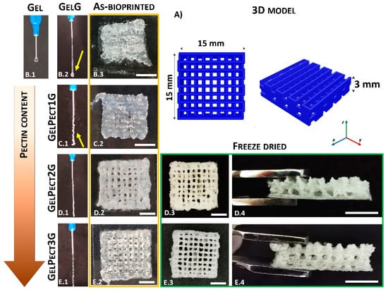 Illustration of the 3D model of a woodpile scaffold (A). Images of the initial bioprinting screening to evaluate fiber formation of GEL (no GPTMS) (B.1), GELG (B.2), GELPect1G (C.1), GELPect2G (D.1), and GELPect3G (E.1); and pictures of 3D woodpile structures as-bioprinted (B.3,C.2,D.2, E.2) and freeze-dried (D.3,D.4,E.3,E.4) (scale bars = 5 mm).