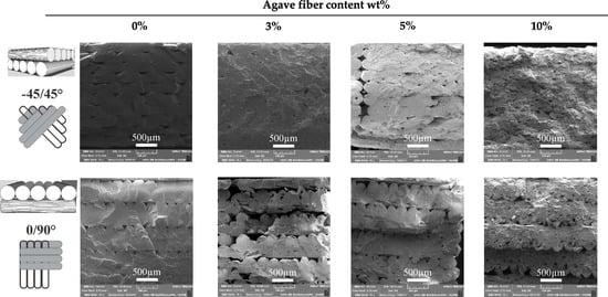 SEM micrographs of agave fibers/PLA biocomposites with different agave fiber content (0, 3, 5 and 10 wt%) and angle deposition (−45°/45° and 0°/90°) (70× magnification).