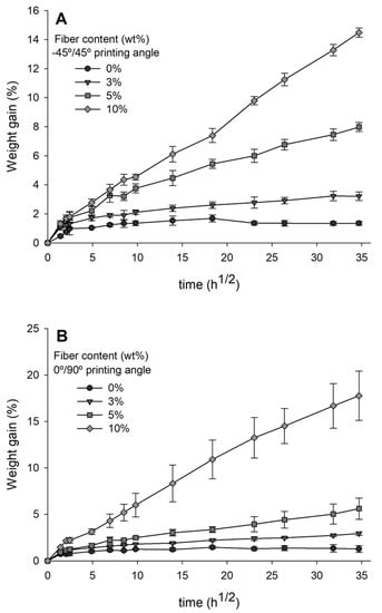 Water absorption of agave fibers/PLA printed biocomposites at different agave fiber percentages (0, 3, 5, and 10 wt%) and (A) printing angle of −45°/45°, and (B) printing angle of 0°/90°.