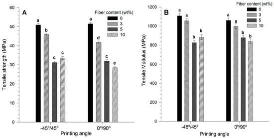 (A) Tensile strength and (B) tensile modulus of printed agave fibers/PLA biocomposites. The letters a–e on top of the bars indicates significant differences (p < 0.05).