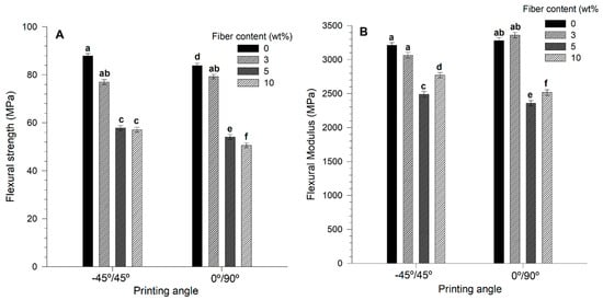 (A) Flexural strength and (B) flexural modulus of printed agave fibers/PLA biocomposites. The letters a–f on top of the bars indicates significant differences (p < 0.05).