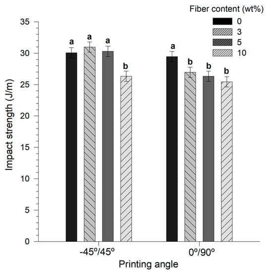 Charpy impact strength of printed agave fibers/PLA biocomposites. The letters a–b on top of the bars indicates significant differences (p < 0.05).