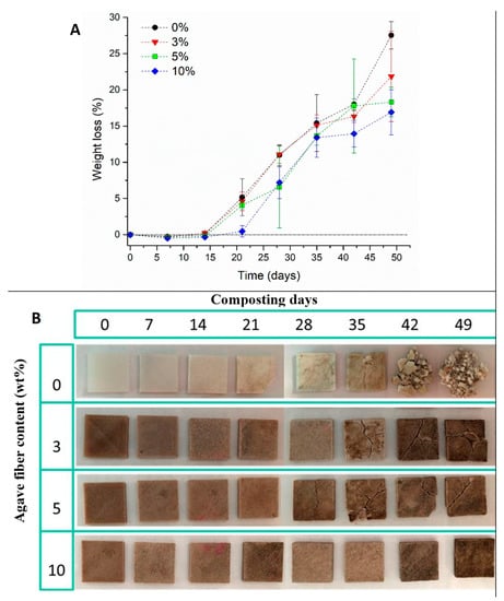 (A) Percentage weight losses of agave fiber/PLA printed biocomposites under simulated composting conditions and (B) photographs of agave fiber/PLA pieces after being composted.