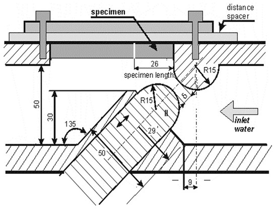 The test device allowed to perform erosion experiments at various cavitation conditions, which were adjusted by the inlet and outlet pressures, the slot width, and the spacer thickness. The pressures were regulated by the inlet and outlet valves. The inlet and outlet valves were located approximately 1 m and 5 m from the from the test chamber, respectively. The specimen was located next to the upper barricade, as shown in Figure 1. In the referenced experiment [17], the cavitation tests were carried out at the inlet pressures = 600, 700, 800, and 900 kPa, and the outlet pressures were an effect of a completely open outlet valve and were equalled to = 123, 125, 129, and 132 kPa, respectively. The slot width was equal to = 5.5 mm, and the distance spacer of 4 mm thickness was used.