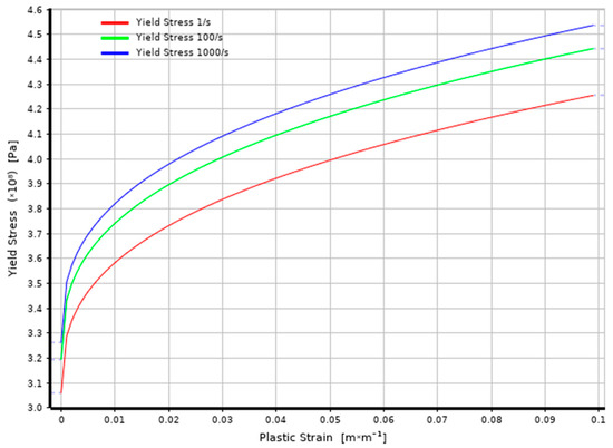 The material properties adopted for the 316L stainless steel micro-jet hammering simulation are presented in Table 2. The Johnson and Cook [18] model was employed in the simulation with strength characteristics presented in Figure 2. This strength model describes the rate-dependent inelastic behavior of solids (elastoplastic hardening under large strains) within certain ranges of equivalent plastic strain rates and temperatures.