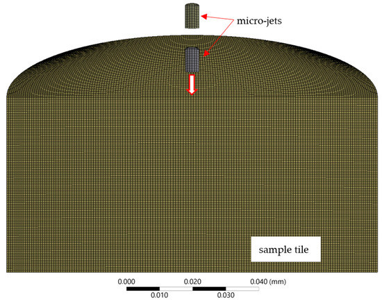 An explicit dynamics simulation code (ANSYS 2020R1) was employed. The tile-shaped sample model was restricted to 40 μm in thickness and 80 μm in diameter (Figure 3). The impact side of the sample was defined as free surface; the two remaining sample surfaces were defined as energy-absorbent impedance boundaries. To reassure initial conditions’ symmetry, the cartesian mesh method was used; the smallest element size accepted by solver was 0.6 μm—measured on elements’ edge.