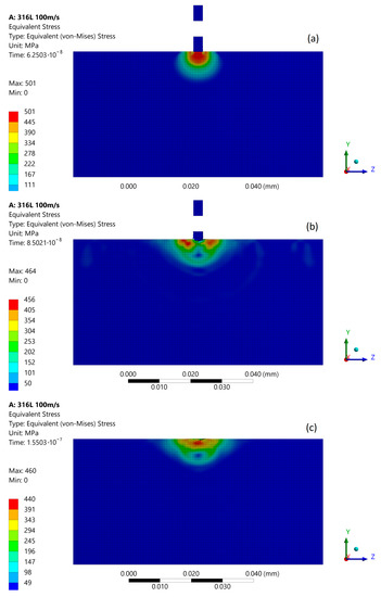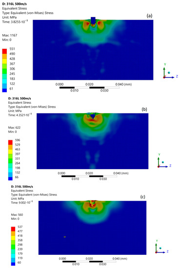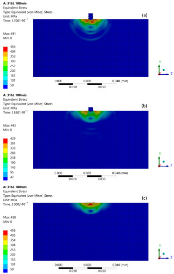 The numerical calculation of the micro-jet impact at 100 m/s creates the maximum stress of 501 MPa that develops in the first stage (Figure 6a). The elastoplastic shockwave stresses resulting from the impact began to develop. In the second stage of impact, the maximum stress was reduced to 464 MPa (Figure 6b). The stress distribution was almost uniform as in the first stage, and a local zone of lowered stresses occurs. It can be expected that after impact, the stress levels in the material will decrease in time, according to the Equations (1) and (2) predictions. After the impact (Figure 6c), the maximum residual stress was 460 MPa, and the zone affected by enlarged stress was approximately 9 µm in diameter. As a result of this impact, a 0.7 µm deep pit was formed.