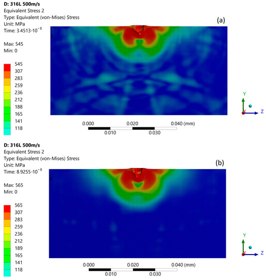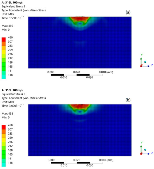 Exceeded yield stress zone (over 307 MPa—red) of 316L stainless steel: (a) after first micro-jet impact; (b) after subsequent micro-jet impact; at 100 m/s.