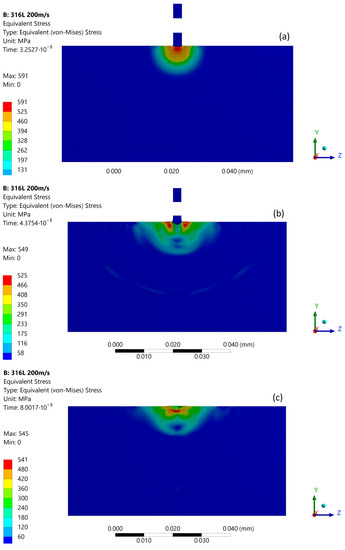 Von Mises stress distribution during subsequent micro-jet impact at 200 m/s: (a) initial stage of the impact; (b) stage during the impact; (c) residual stress after the impact.