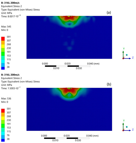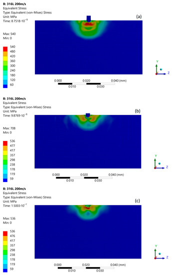 The subsequent micro-jet impact at 200 m/s creates the maximum stress of 540 MPa that develops in the first stage (Figure 10a). In the second stage of impact, the maximum stress was momentarily increased to 708 MPa (Figure 10b). The stress distribution was not uniform as in the first stage, and a local zone of high stresses occurs. After the impact (Figure 10c), the maximum residual stress was 538 MPa, and the zone of enlarged stress was approximately 11 µm. As a result of the subsequent impact, a 1.3 µm depth of pit remained. Figure 11 presents the size comparison between zones of exceeded yield stress (red) created after first and subsequent micro-jet impact. In the case of 200 m/s impact velocity, the exceeded yield stress zone was enlarged after subsequent impact. Therefore, the elastoplastic strain hardening was insufficient to prevent the material from further deformation.