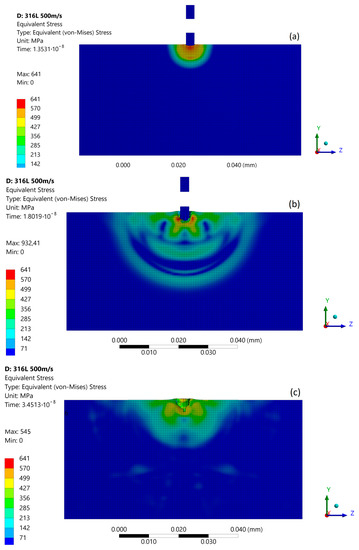 With an increased impact velocity to 500 m/s, the maximum stresses at the moment of the first micro-jet impact increases to 641 MPa, and the depth of pit amplifies to about 1.2 μm (Figure 12a). In the second stage of impact, the maximum stress reaches to 932 MPa, triggering the FE degradation process and asymmetric stress distribution (Figure 12b). The impact shock wave was also visible. The estimated stress amplitude of the shockwaves at a 500 m/s micro-jet impact was 250 MPa. After the impact (Figure 12c), the maximum residual stress was 545 MPa, and the zone affected by enlarged stress was approximately 16 µm in diameter. As a result of the subsequent impact, a 3.6 µm depth of pit was created.