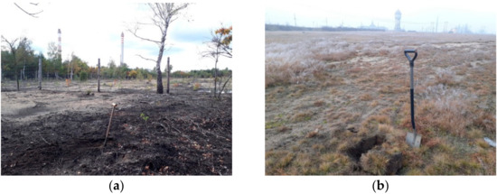 Average analytical samples of two soils taken at a 0–15 cm depth from industrial degraded areas located in Upper Silesia in Poland were used in these investigations. One of the soils originated from Miasteczko Śląskie (S1) located in the nearest vicinity of a zinc smelter (Figure 1a) and the other from Szopienice (S2), the former area of non-ferrous metals steelworks (Figure 1b). The soil samples were air dried, crushed and passed through a 2 mm sieve. The soil samples were analyzed as described in the analytical procedures section. Four one-kilogram samples were separated from each soil. One sample of each soil without any additives was set as a control sample. The other samples were mixed thoroughly with poultry manure (PM) and a proper amount of CaO2. Poultry manure was collected from commercial poultry houses situated in Silesia region in Poland. The sample of PM was analyzed as described in the analytical procedures section.