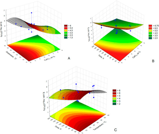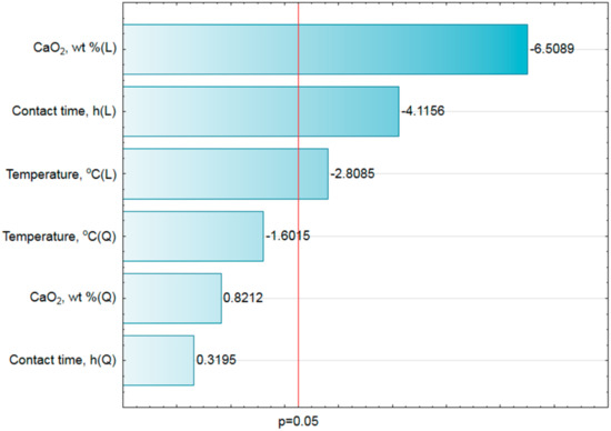 The conducted statistical analysis (Table 3) presented three (except constant value) significant parameters (p < 0.05), i.e., CaO2 (L), temperature (L) and the contact time (L). Other parameters were statistically insignificant (p > 0.05), including CaO2 (Q), temperature (Q) and time (Q). Moreover, the results of the analysis showed that the value of mean square error was 0.3877.