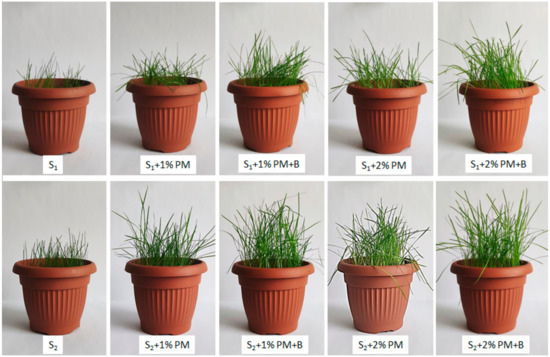 In addition, it was noted that in S2 soil, the increased amount of PM additive at 2 wt. % did not affect plant growth as significantly as in S1 soil. The content of heavy metals in the soils also had an impact on the plant growth and development. The concentration of toxic heavy metals such as Zn, Pb or Cd (Table 1) may result in less plant growth in soil S1 compared to soil S2.