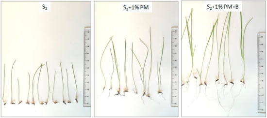 Moreover, the analysis of the impact of the CaO2 addition showed the stimulating effect on the plant growth in comparison to the plants grown on grounds amended with PM. For the S1 the mass of the plants growing on the soils enriched with the microbiocidal agent before drying amounted to 1.790 g (S1 + 1% PM + B) and 1.837 g (S1 + 2% PM + B), whereas the plant mass for the soil S2 + 1% PM + B and S2 + 2% PM + B reached 2.221 g and 2.811 g respectively.