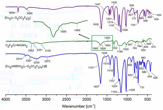 Synthesis was carried out using Schlenk glassware and a glove box in an argon atmosphere. [Cu2(µ-O2CR)4] (0.5 mmol, R = CF3, C2F5, C3F7, C4F9) was placed in a round-bottomed flask, and 20 cm3 of anhydrous acetonitrile was added, followed by the introduction of pentafluoropropylamidine (AMDH, 1 mmol). The resulting dark-blue solution was stirred for 24 h. After this time, the solvent was removed under reduced pressure (1.3 × 10−3–1.3 × 10−4 mbar). The obtained compounds were green-blue solids, stable in air. Yields ranged between 66% and 83%. No crystals suitable for an X-ray structure determination were obtained.