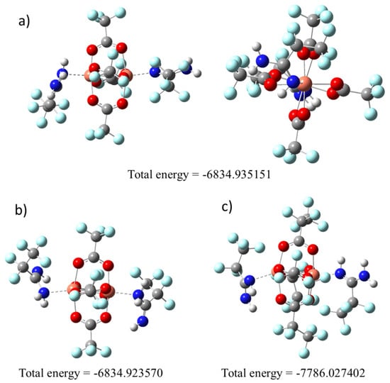 Optimised compounds structures by the density functional theory (DFT) M06/6-311G(d,p) method: (a) [Cu2(AMDH)2(µ–O2CCF3)4] (1), =NH bonded; (b) [Cu2(AMDH)2(µ–O2CCF3)4] (1), –NH2 bonded; (c) [Cu2(AMDH)2(µ–O2CC2F5)4] (2), =NH bonded.