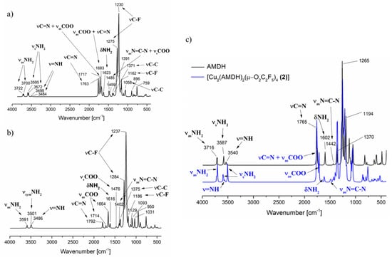 Theoretical infrared spectrum calculated by DFT M06/6-311G(d,p): (a) [Cu2(AMDH)2(µ-O2CCF3)4] (1), =NH bonded amidine, (b) [Cu2(AMDH)2(µ-O2CCF3)4] (1), –NH2 bonded amidine; (c) [Cu2(AMDH)2(µ-O2CC2F5)4] (1), =NH bonded (blue line) and AMDH (black line).