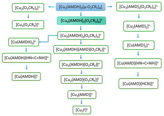 Fragmentation scheme for metallated fragments of [Cu2(AMDH)2(µ-O2CRF)4].