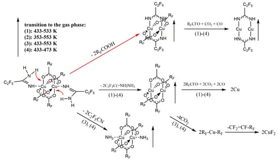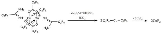 In the second stage of decomposition, decarboxylation occurred, and the perfluorinated groups were still bound to the central atom. Formation of [Cu(CF3)2]− ion, with fluorocarbon group bonded to the copper atom, has been proved by Rijs et al. in their research on the mechanism of decomposition of [Cu2(µ-O2CCF3)4] using mass spectrometry [63]. Moreover, in the electron collision experiments with [Cu2(µ-O2CC2F5)4], the [Cu(CF3)2]− ion was formed [64].