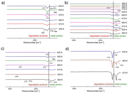 Enlargement of the area of occurrence of metal carriers (green) and degradation products’ (red) characteristic bands: (a) [Cu2(AMDH)2(µ-O2CCF3)4] (1), (b) [Cu2(AMDH)2(µ-O2CC2F5)4] (2), (c) [Cu2(AMDH)2(µ-O2CC3F7)4] (3), (d) [Cu2(AMDH)2(µ-O2CC4F9)4] (4).
