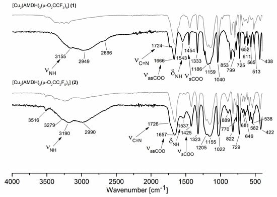 Infrared spectra for the compound [Cu2(AMDH)2(µ-O2CCF3)4] (1) (top) and [Cu2(AMDH)2(µ-O2CC2F5)4] (2) (bottom) before sublimation (gray) and after sublimation (black).