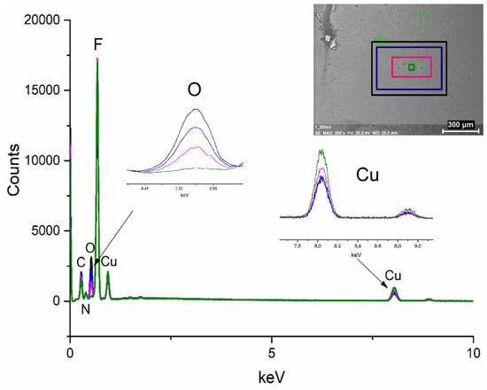 EDX spectra were taken during the SEM analysis, each of them recorded for 30 s. During the experiment, the scanning area was reduced, which increases the dose of electrons (Figure 10). With the increasing dose of electrons, the oxygen content decreases, the carbon content is slightly reduced, and the copper content increases. The contents of the other elements were almost the same.