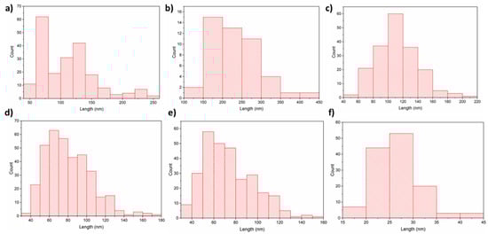 Histograms of a grain-size distribution: (a) [Cu2(AMDH)2(O2CC2F5)4] (2), TV = 453 K, TD = 593 K; (b–d) [Cu2(AMDH)2(O2CC2F5)4] (2), TV = 393 K, TD = 633 K, in the case of (b), the transport way of vapours was shorter; (e) [Cu2(AMDH)2(µ-O2CC3F7)4] (3), TV = 453 K, TD = 633 K; (f) [Cu2(AMDH)2(µ-O2CC3F7)4] (3) TV = 393 K, TD = 573 K.
