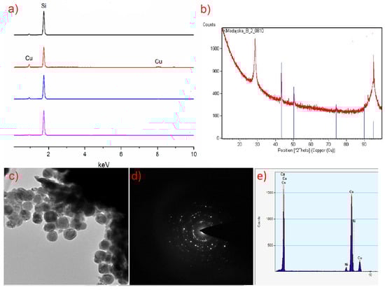 Composition analysis of the obtained layers using precursor (2) [Cu2(AMDH)2(µ-O2CC2F5)4]: (a) EDX spectra: black line: TV = 453 K, TD = 593 K; red, blue and pink line: TV = 393 K, TD = 633 K, in the case of the red line, the transport way of vapours was shorter; (b) XRD analysis; (c) TEM image; (d) diffraction pattern; (e) EDX spectra from TEM.